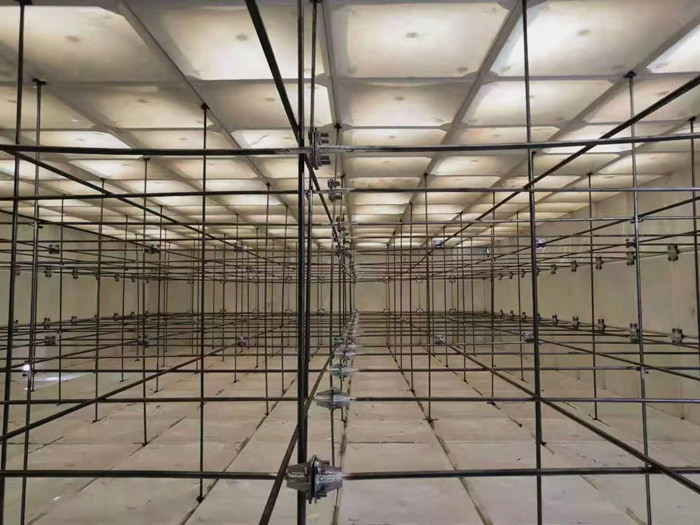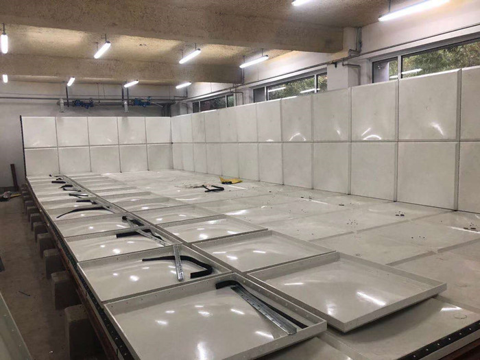 焊接玻璃鋼水箱底板,焊縫均勻整齊,不得有氣泡、焊坑,在底板上組裝點(diǎn)焊玻璃鋼水箱下側(cè)板四周,組裝前按圖紙要求選定相應(yīng)板厚的模塊,將模塊四周折邊敲正校平。先將下側(cè)板點(diǎn)焊于底板四周,點(diǎn)好后測(cè)量四周方框的兩條對(duì)角線長(zhǎng)度誤差不得大于2mm,要已點(diǎn)焊后的下側(cè)模塊整體橫平豎直組合方正。
